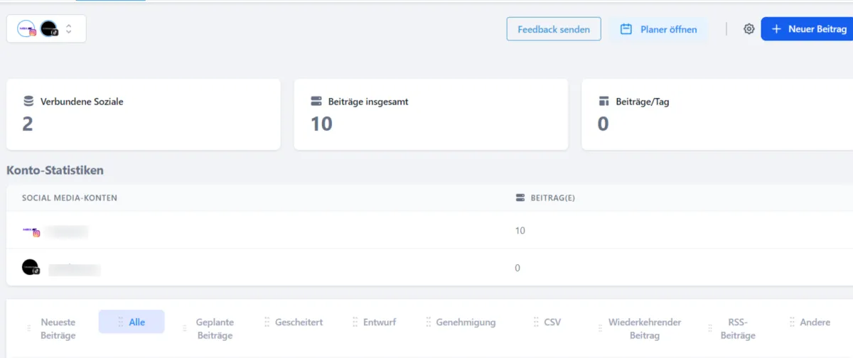 Unser Social Media Planner bietet Analysetools, mit denen Sie die Leistung Ihrer Beiträge überwachen können. Sie erhalten Einblicke in Kennzahlen wie Reichweite, Engagement und Interaktionen, um den Erfolg Ihrer Social-Media-Strategie zu messen.